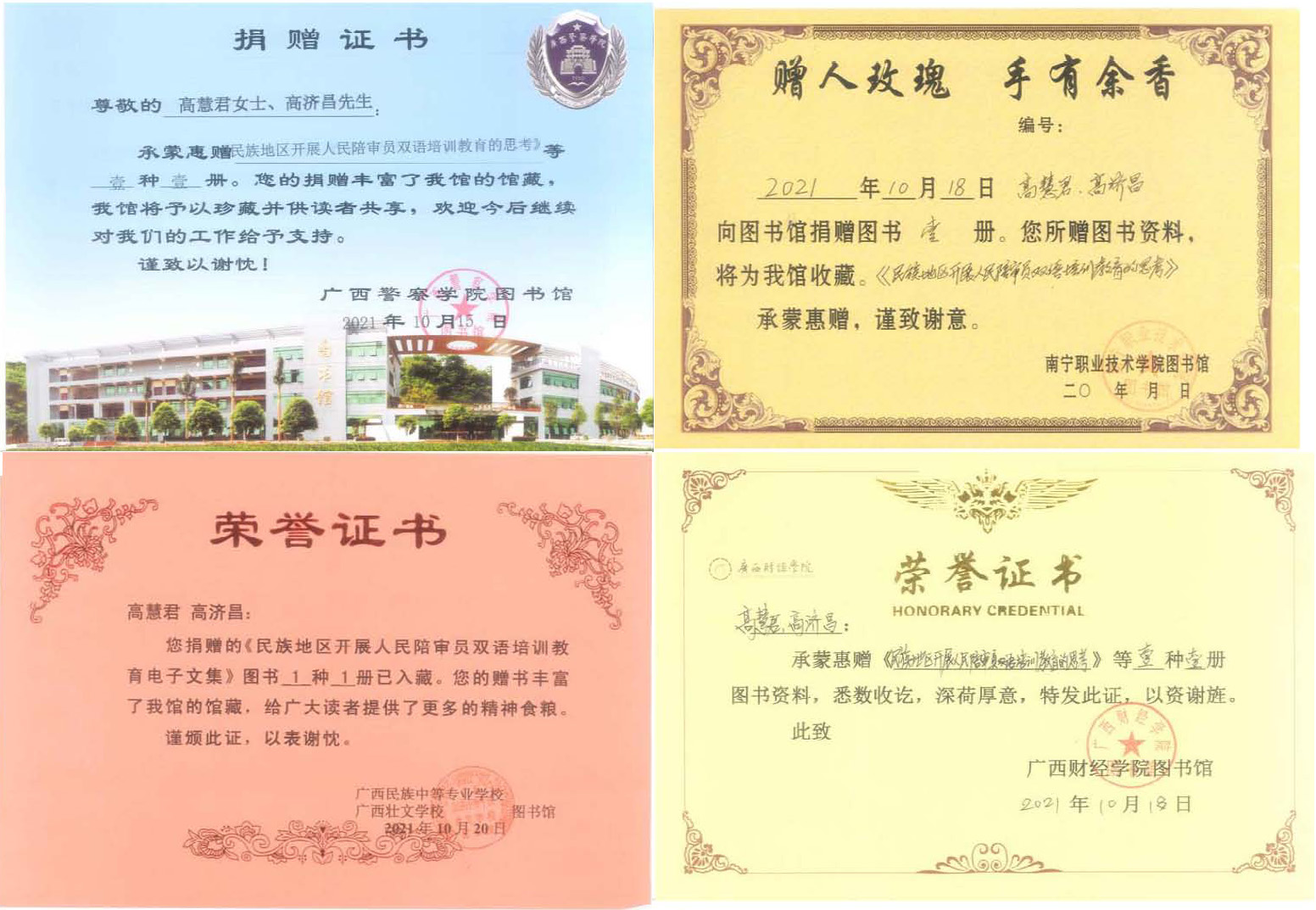 经专家学者推荐至今《民族地区开展人民陪审员双语培训教育的思考》壮文版文集相继有广西图书馆、南宁市图书馆、广西大学图书馆、广西民族大学图书馆、南宁师范大学图书馆、南宁职业学院图书馆、广西财经学院图书馆、广西警官学院图书馆、广西职业师范图书馆和广西民族中专等图书馆收藏。