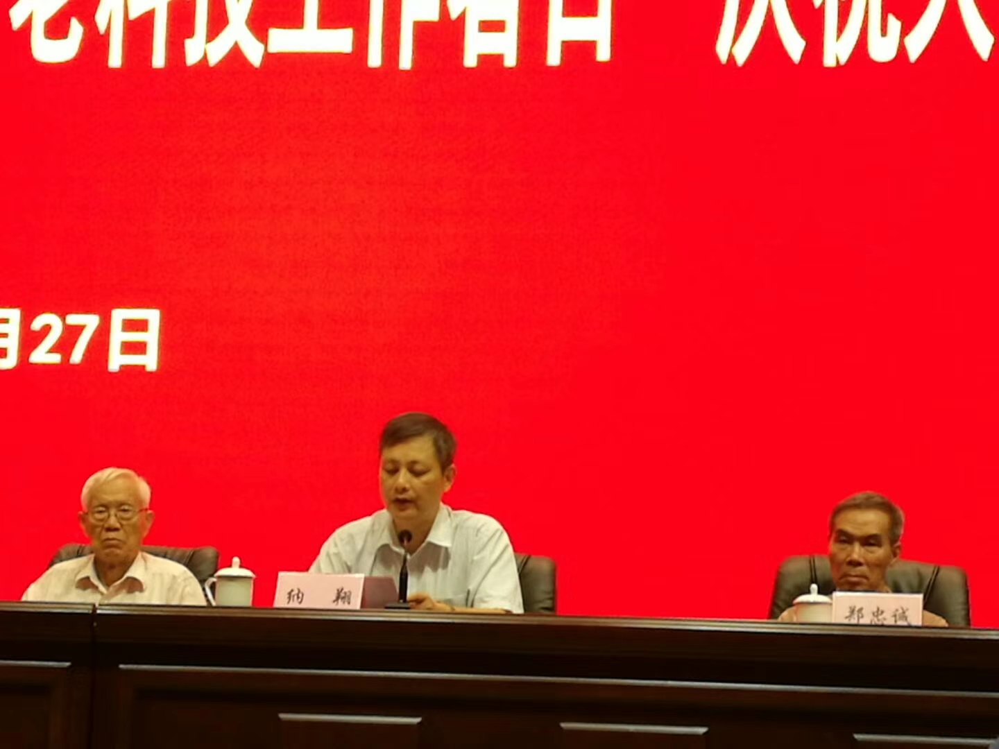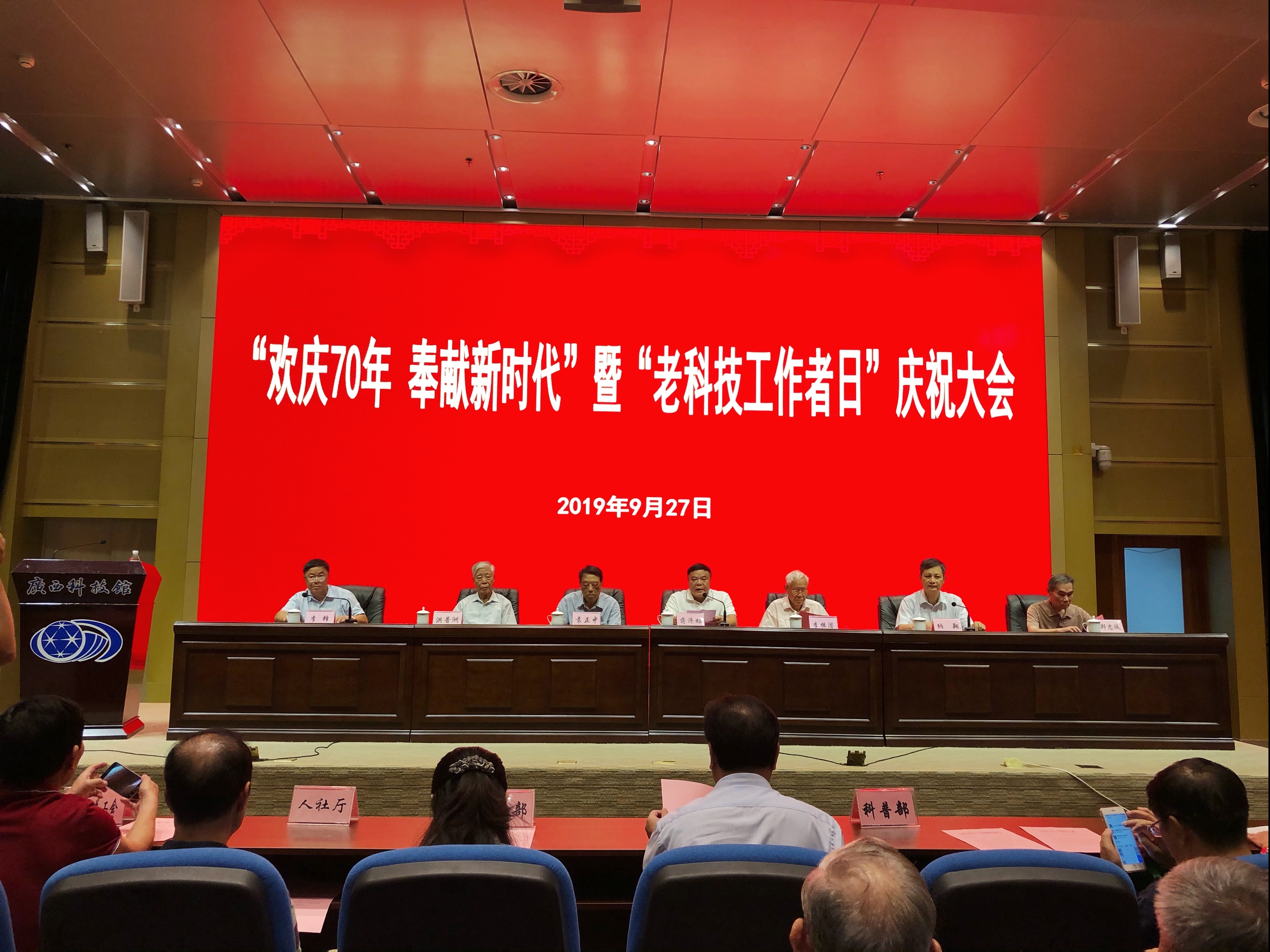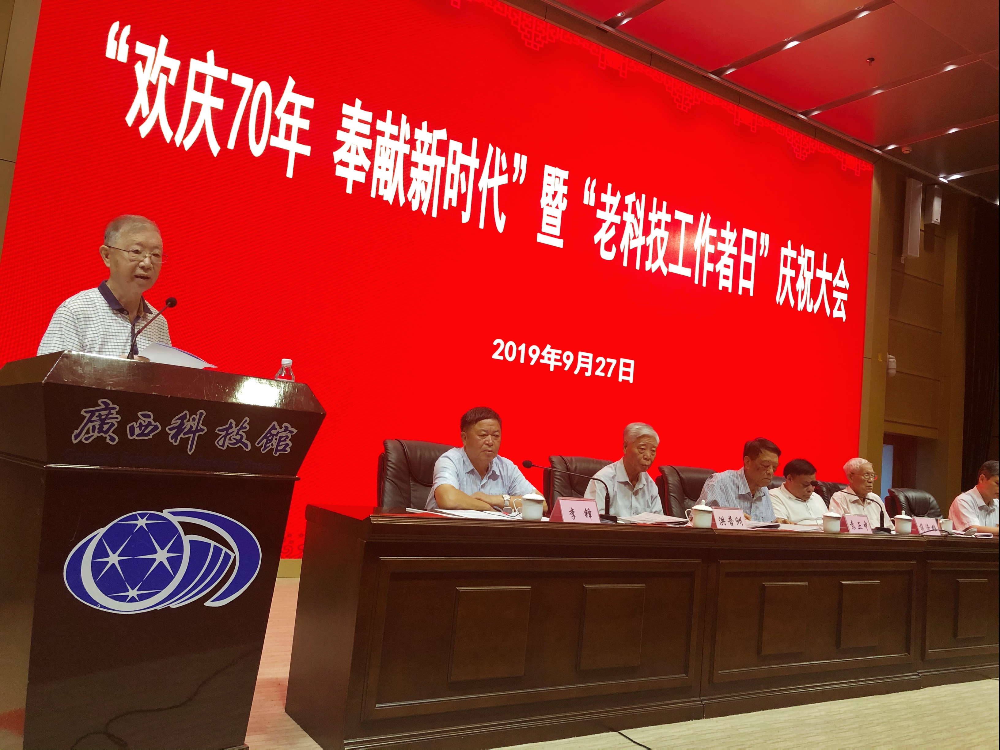 2019年9月27日上午九点,广西老科协在广西科技馆学术报告厅召开“欢庆70年,奉献新时代”暨“老科技工作者日”庆祝大会,大会在雄壮的国歌声中拉开序幕。中国老科协副会长、广西老科协会长蒋济雄及袁正中、李振潜、洪普洲、郑忠诚等老领导出席大会。区党委组织部、人社厅、科技厅、区科协、区总工会等厅局派员参加大会。