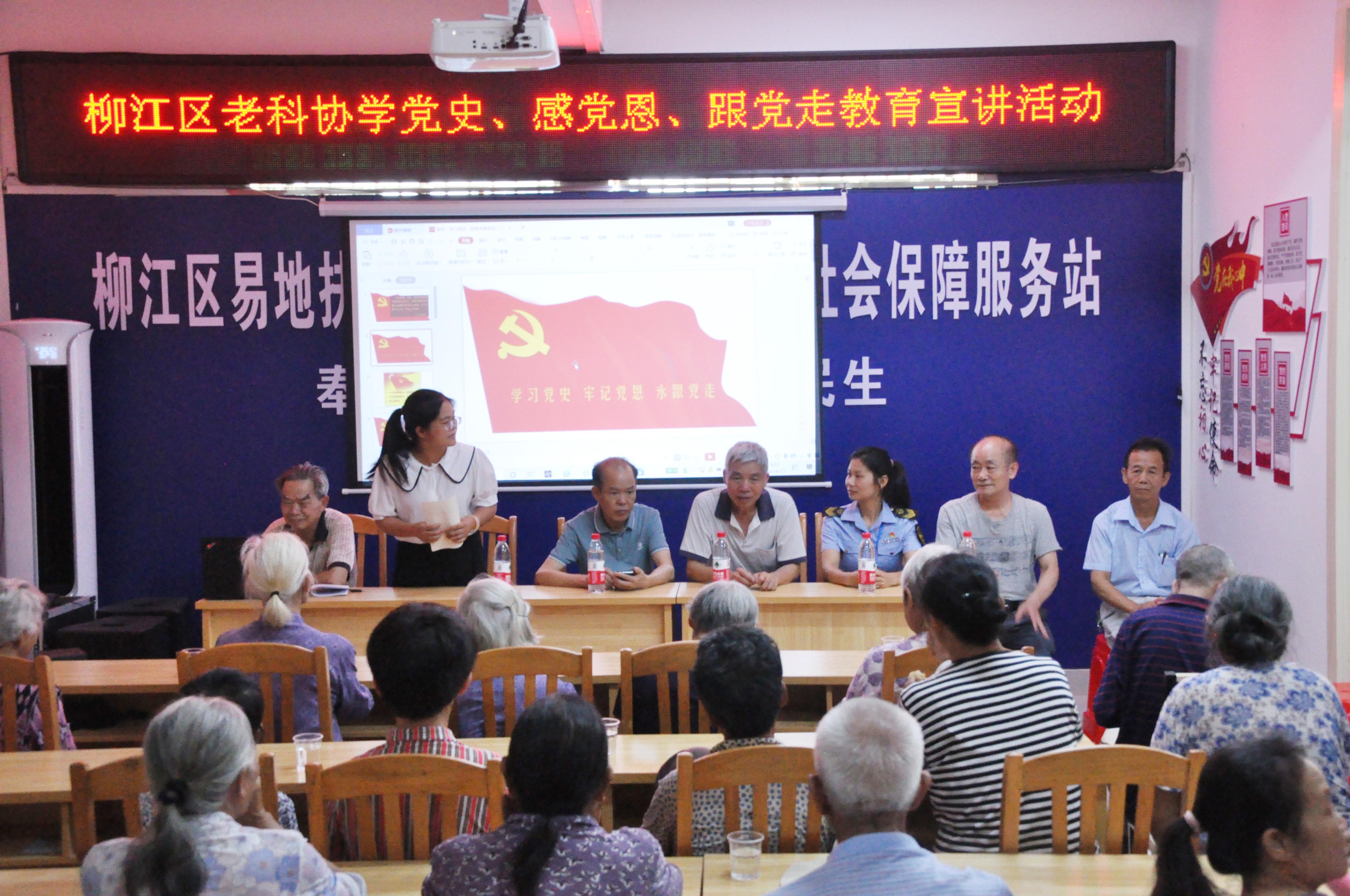 该社区于6月17日请区老科协及老科协卫生分会、区关工委、区疾控中心、区禁毒防艾办、市场监管局等六个单位进社区分别举办宣传活动。听宣传的兴柳社区群众除了外出务工外,其余守家的老人近60人全部参加,有的老人背着孙子女到场听课。宣传活动内容多样,有学党史、感党恩、跟党走。有防病治病、有禁毒防艾、有市场监管等方面宣传到老乡家园群众中。活动以电脑投影播放、技术员和专家宣讲,为了扩大宣传面,采取发放宣传资料、发放印有宣传文字的宣传袋、宣传盆。宣传桶等共500多份,还有医师给群众义诊、为病人咨询,为病人开处方等形式宣传到老乡家园群众中,到场群众受到多样的科普教育,大家为社区此举表示满意和点赞。对各单位进社区进行科普宣传表示衷心感谢,老人们激动地说,过去我们在山区没懂得有这么多的科普知识今天知道了,更深层地认识到,没有共产党就沒有我们今天的幸福。图为举办宣传活动的情景。