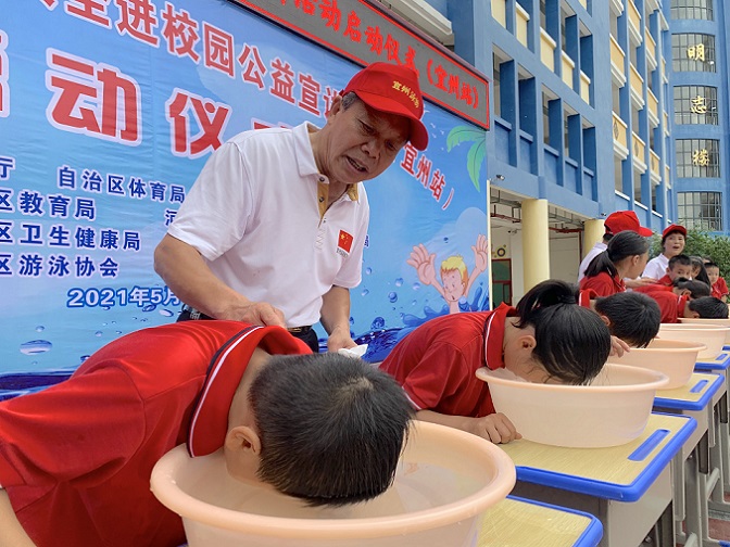 宜州区老科协理事韦荣芳在指导学生进行防溺水模拟演练
