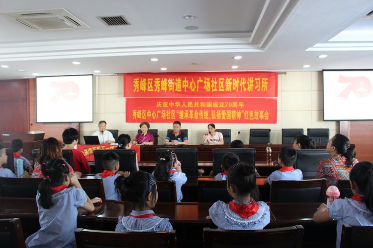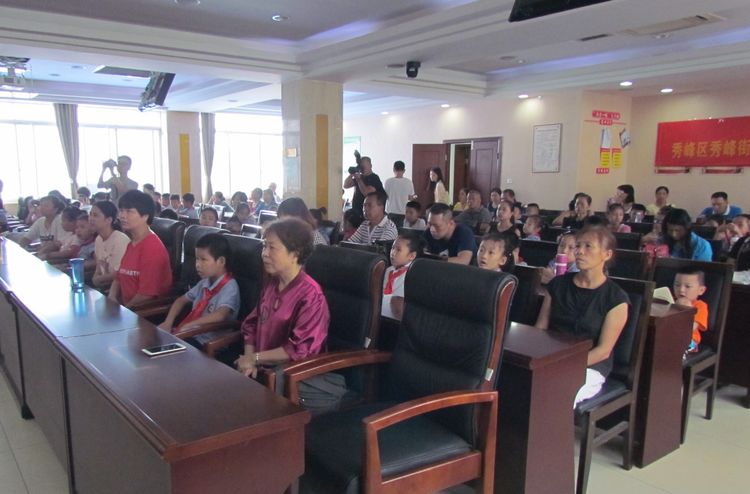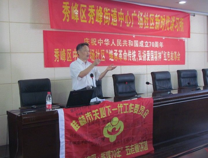 听取共和国英模事迹报告的人员有桂林市秀峰区秀峰街道办事处中心广场社区的学生及其家长等共100多人。
