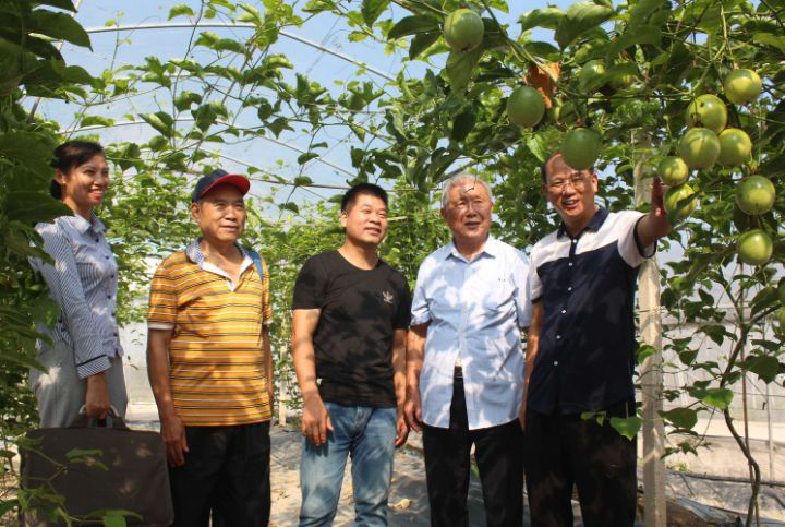 桂林市老科协根据种植农户的需求和产业扶贫要求,已连续三年举办百香果栽培技术培训班,为提高果农的栽培水平起到了积极作用。但也面临许多亟待解决的问题。为了进一步提高果农的栽培水平和专项培训的效果,桂林市老科协副会长兼秘书长叶战(右一)、副会长暨科普演讲团副团长崔连山(左一)和服务“三农”工作委员会副主任陈永孝(左二)等同志于2019年7月31日到桂林五彩果蔬农业发展公司和桂林千烨农产品公司开展专题调研,观摩考察了两个单位的百香果种植基地和百香果苗母本园及五彩果蔬公司的百香果加工生产设施,与百香果种植基地的负责人及部分种植农户进行了座谈或个别交谈,深入了解百香果种植的现实状况和果农的具体需求,为举办百香果栽培技术培训班做前期准备。