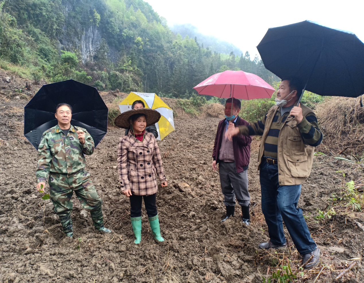 为了试验罗汉果在该县南北部种植土地的适宜和对比情况,该县老科协科学选择适宜土地,除了在该县南部的水源镇三才村亮山山脚下一片平坦土地试验种植30多亩外,还在气温较低的北部明伦镇豪洞村乾新屯、柳平村分别试用种植30亩。春节过后,由于受到疫情影响,各地普遍封村封路无法下去调研检查。但是环江老科协心中时刻惦记着种植试验户的准备工作情况。继3月15日前往水源镇三才村亮山山脚下检查罗汉果种植试验基地之后,于3月17日又前往明伦镇豪洞村乾新屯调研罗汉果种植试验基地,当天老科协理事戴着口罩来到种植试验户家中了解准备工作情况,接着冒着瓢泼大雨深入到种植试验户的地里检查土地平整和各项准备工作情况。该屯组长、种植户陆开蒙(女)在她的地里介绍说,她已平整土地面积8亩,已从山上砍伐竹子木桩500多根,另外其他户也已经作好种植准备。老科协会长欧永成、老科协理事、种植罗汉果组组长莫家文在地里向陆开蒙介绍了种植罗汉果的技术和方法,严格按照规格和技术进行科学种植,并要求她动员种植户抓紧时间做好种植准备工作,在4月中旬以前一定完成种植任务。